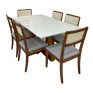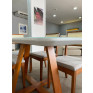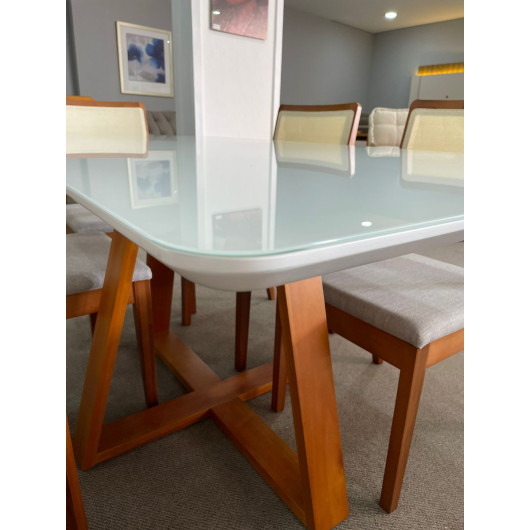 A mesa de jantar possui estrutura em acabamento lâmina de madeira tauari, com base em formato moderno faz o encaixe perfeito das cadeiras.