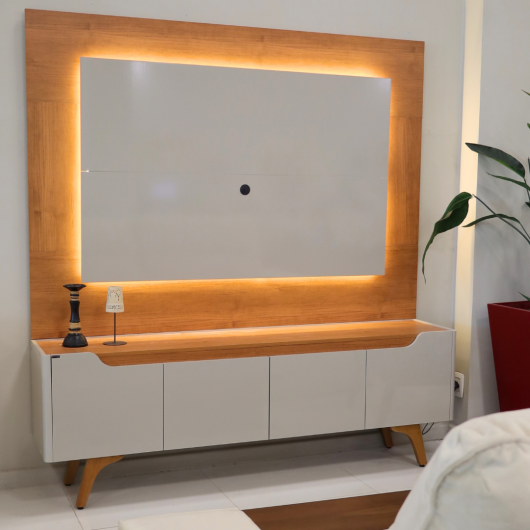 A sua sala de estar ganhará ainda mais elegância, charme e beleza. Com iluminação em LED, que dá outra vida para o produto, o painel possui 15mm de espessura, sendo os centrais em MDF e está disponível nas cores naturalle com platinum e naturalle com off white. Esse lindo rack tem dobradiças de 35mm com slow motion, gaveta central com corrediça telescópica reforçada, pés de madeira maciça e cantos com acabamento curvo em MDF.