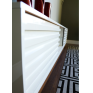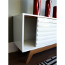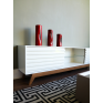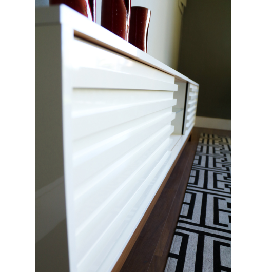 Com duas portas de correr com detalhes ripados, e uma prateleira de vido ao centro. Além de um design atemporal, ele traz