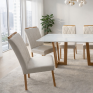 Já as cadeiras que possuem além de um tom clássico no linho, aplicações de costura que dão um charme a mais, também contam com puxador superior com acabamento de madeira, que mantém a durabilidade, sem falar na estrutura totalmente estofada, produzida em alta qualidade pernas em madeira, garantido o conforto e resistência.